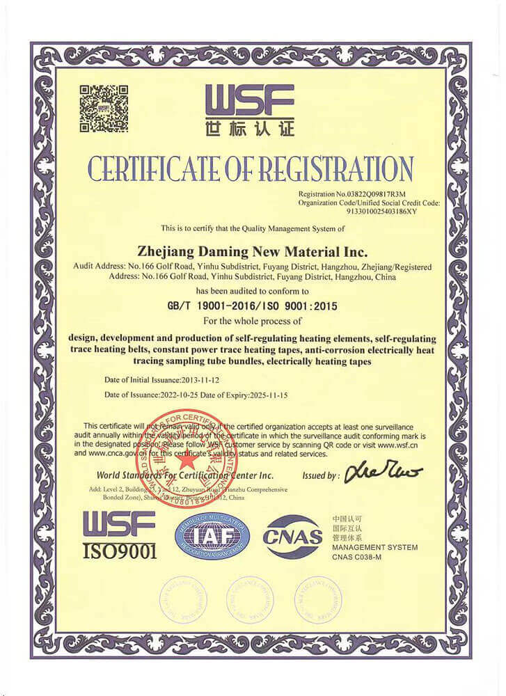 浙江制造認(rèn)證證書(加強(qiáng)型電加熱帶)